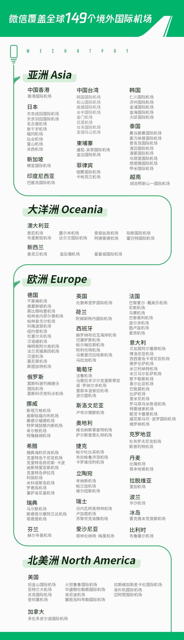 随着中国游客的足迹走遍世界,目前,全球已有逾149家国际机场接入微信,其中扫码支付、小程序导览、小程序免税预购、公众号信息查询与出行指引推送、腾讯退税通小程序等全平台生态服务场景在不同机场落地!